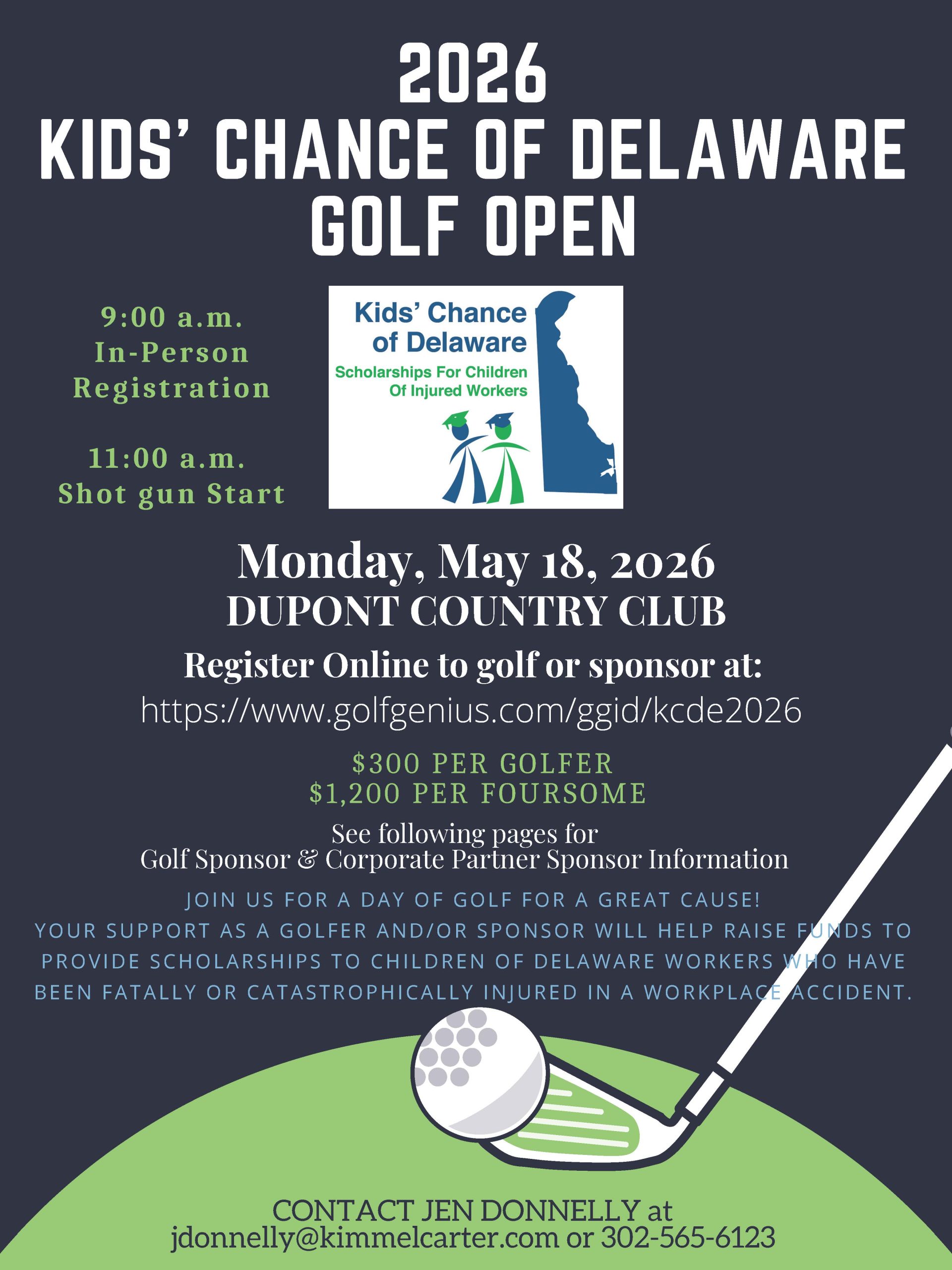 Join us May 18, 2026 at DuPont Country Club in supporting a great cause through a day of golf! Your participation as a golfer or sponsor will contribute to raising funds for scholarships, benefitting children of Delaware workers who have been tragically affected by workplace accidents.